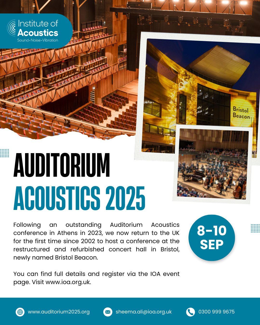 The Institute of Acoustics has the great pleasure to announce it is holding the 12th International Conference on Auditorium Acoustics 2025,8-10 September at The Bristol Beacon, Bristol United Kingdom